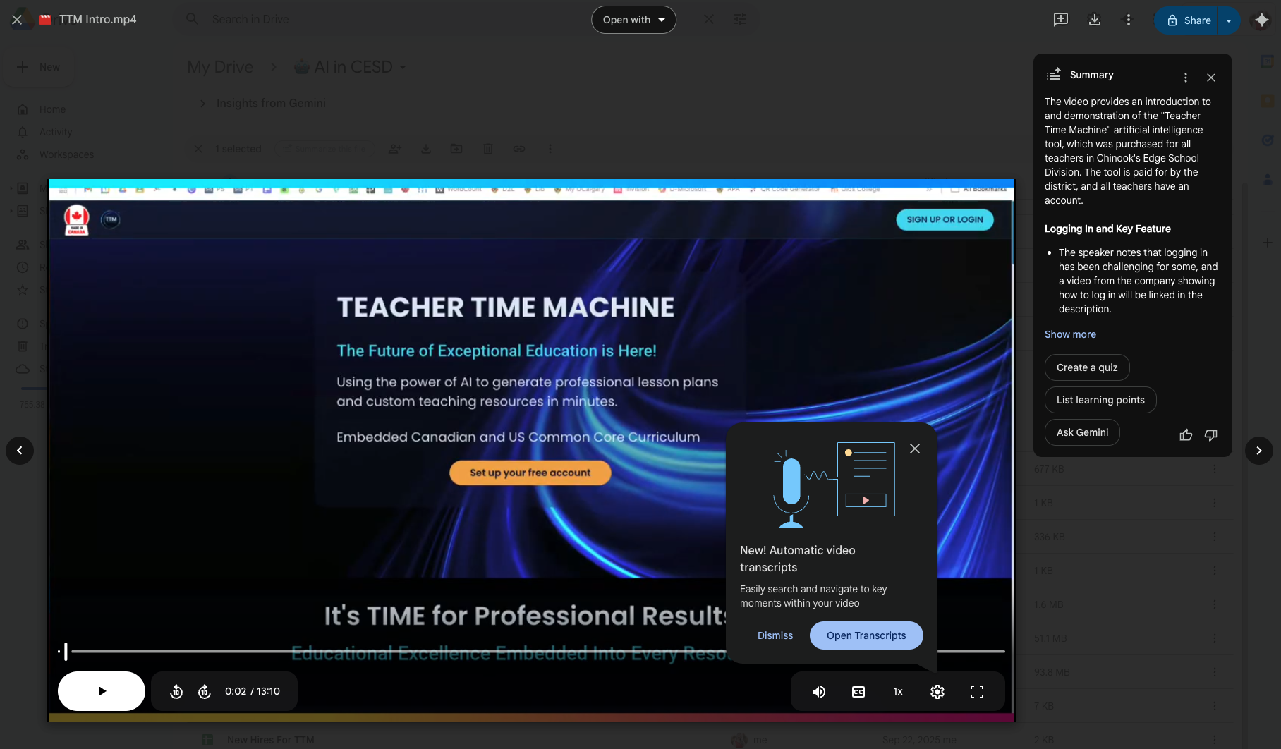 Do a search in your Google Drive for “.mp4” and double click on one of the files and watch AI generate some text for you regarding the videoyou’ve just clicked on. It will also offer to generate a transcript of the video, and there’s a button to create a quiz based off the video too!!